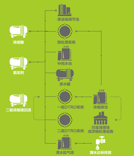 通过提升泵将渗滤液输送至两级DTRO渗滤液处理设备处理,产水达到排放标准直接外排,浓缩液回灌至填埋场。