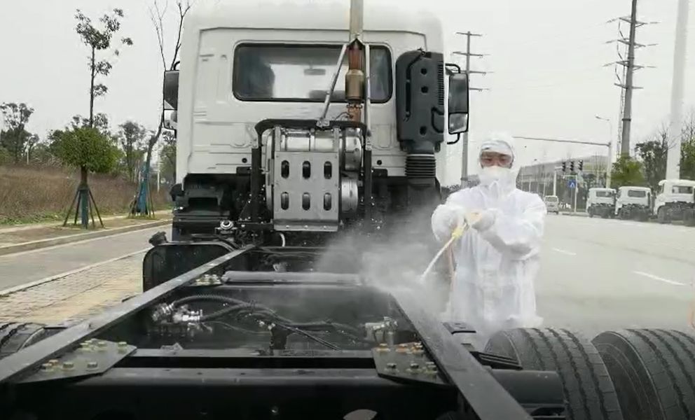 东风商用车生产基地在湖北十堰疫情重灾区,东风商用车的物流司机将底盘车送至湖南境内的高速路口岳阳北收费站后返回湖北集中隔离,再由熊猫体育环境的物流司机接回厂区。整个交接运输过程中,每一辆底盘车在出厂、高速路口、熊猫体育环境长沙园区必须经历三次的专业消毒,确保安全,万无一失。