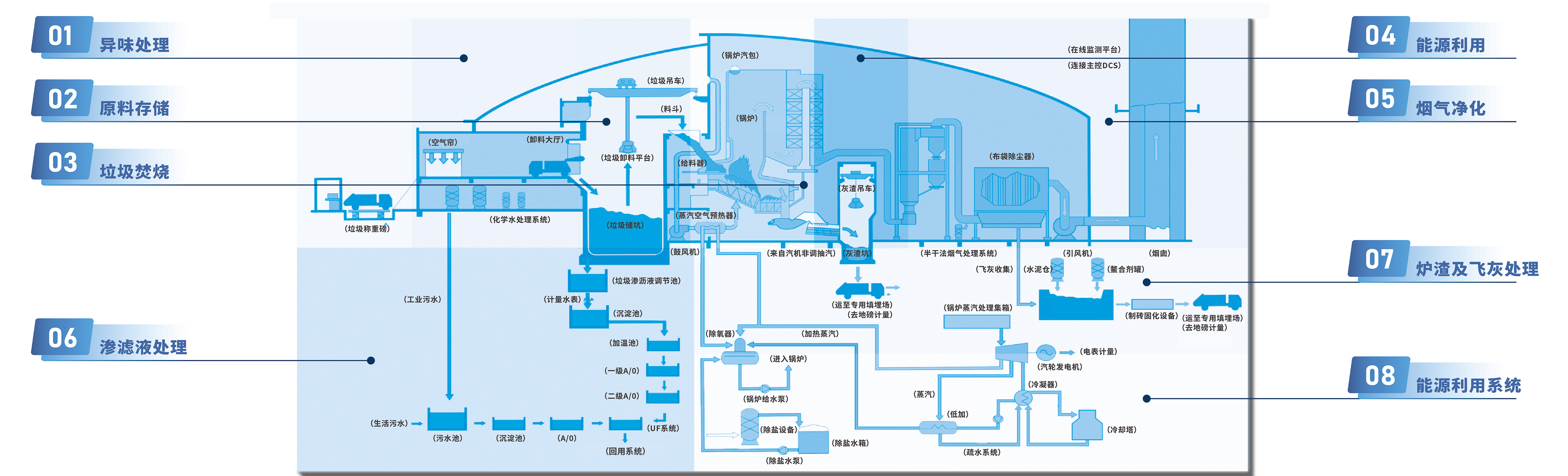 熊猫体育环境生活垃圾焚烧发电处理模式将全流程划分为八大模块,构建囊括垃圾入库、储存、焚烧,烟气净化、渗滤液处理、炉渣及飞灰处理、热能产生、能源利用的八大系统。